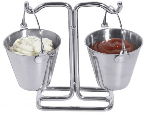 Serviergestell mit Sauceneimer Menagengestell aus Edelstahl 18/0, mit zwei Serviereimern 1435/075 aus Edelstahl 18/10, zum Servieren von Ketchup- und anderen Saucen-Portionen Höhe: 10,5 cm, Breite: 9 cm
