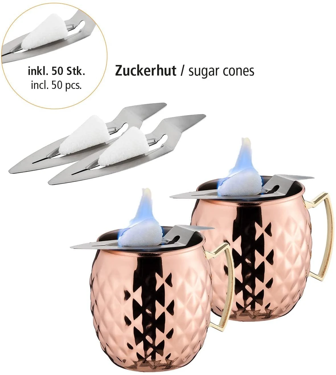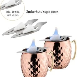 Für Liebhaber der Feuerzangenbowle ein absolutes Muss. Die Becher im Kupfer-Look ermöglichen ein perfektes Vorbereiten und Genießen des Traditionsgetränks. Das Mini-Feuerzangenbowle Set besteht aus: 2 Edelstahl Becher im Kupfer-Look. Die 2 stabilen Zangen sind aus rostfreiem Edelstahl hergestellt. Aufgrund ihres Materials sind die Zangen also hygienisch, geschmacks- und geruchsneutral. Die Becher haben die Maße von 9 x 9 cm. Die Höhe beträgt 10 cm. Sie fassen je bis zu 0,5 Liter. Die Zangen haben die Maße 3,5 x 14,5 cm. Ihre Höhe beträgt 1,5 cm. Ihr Gewicht liegt bei 0,10 kg. Durch das Abspülen mit einem freuchten Tuch, warmem Wasser und Spülmittel werden Lebensmittelreste ganz leicht entfernt.