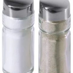 Salz-/Pfefferstreuer aus glattem Pressglas, Kappe aus Edelstahl Maximaler Glasdurchmesser: 3 cm, Höhe: 9 cm