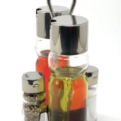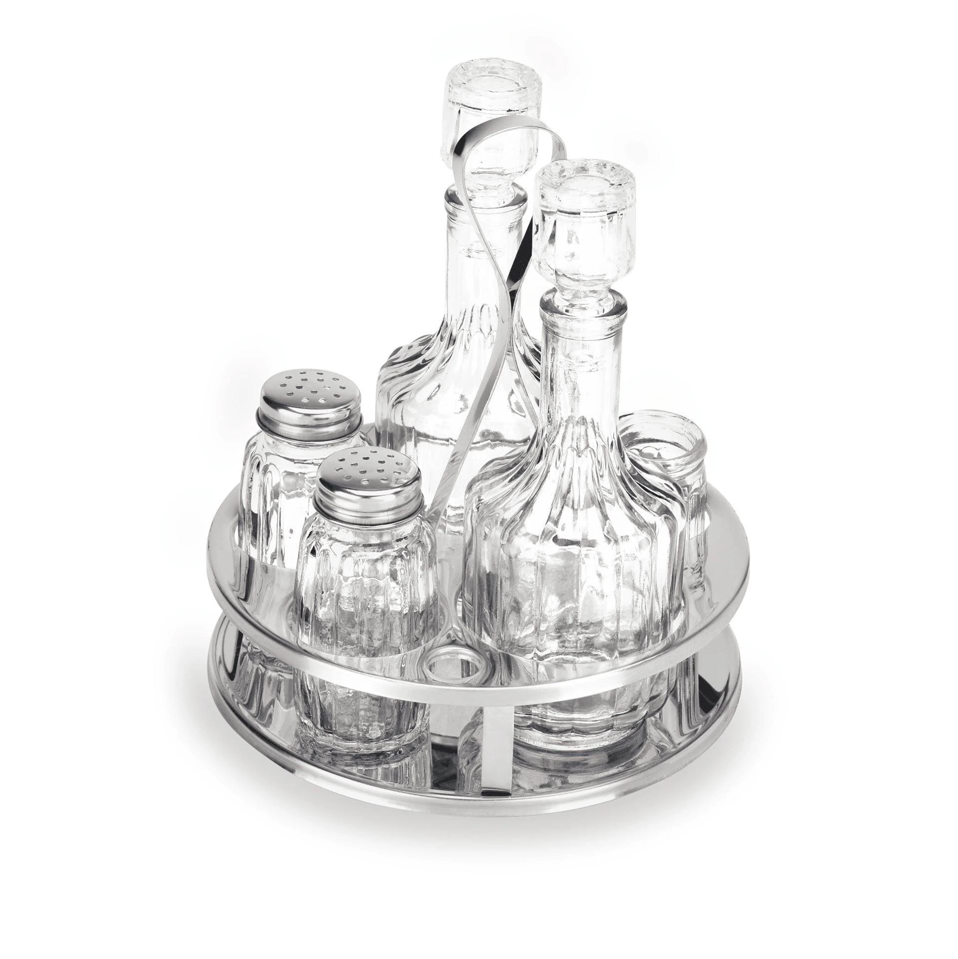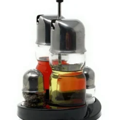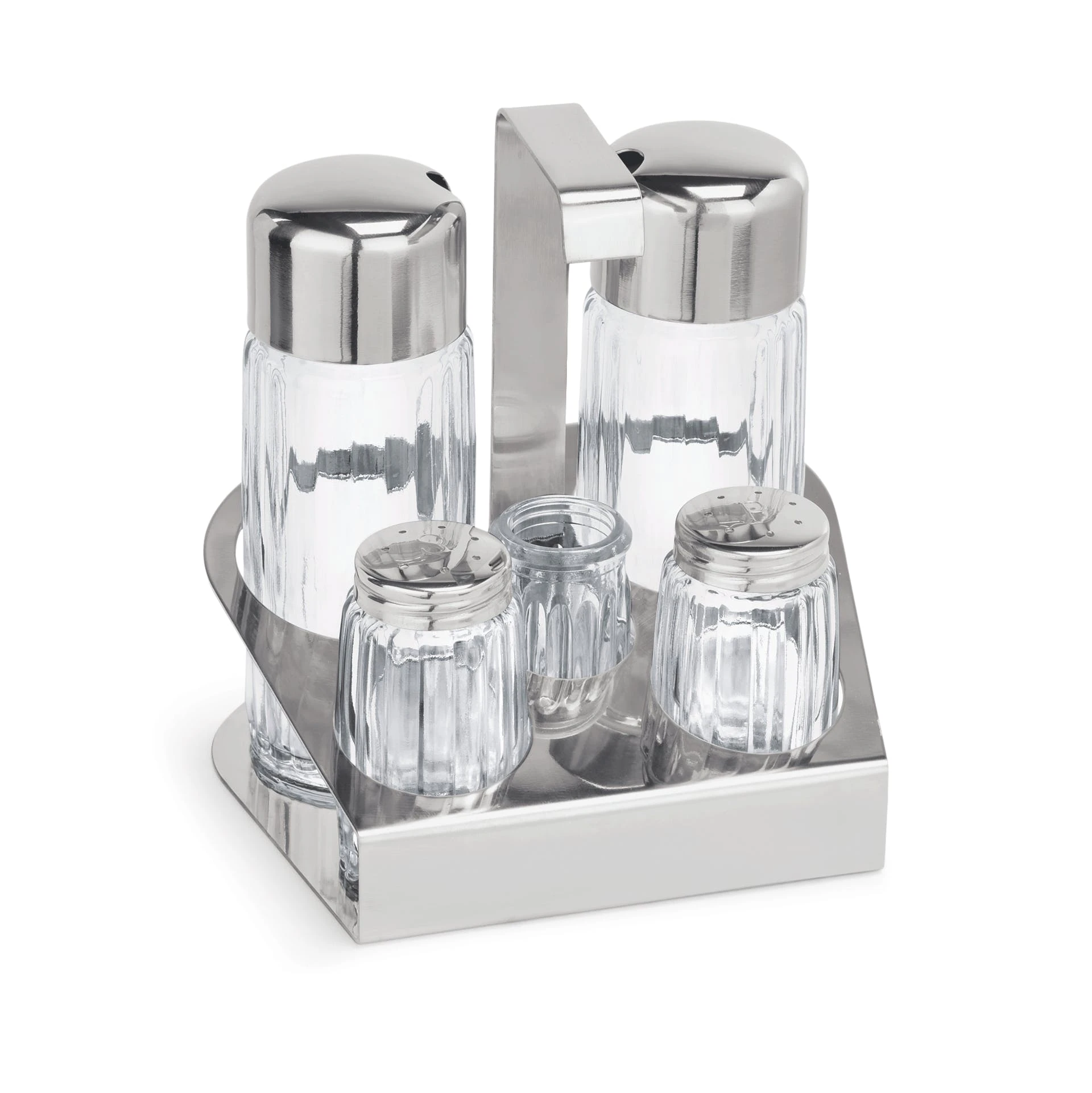 Menage 5-teilig aus Edelstahl 18/10, hochglĂ€nzend, mit schweren geriffelten GlaseinsĂ€tzen Essig Ăl (mit tropffreien AusgĂŒssen), Zahnstocher, Salz Pfeffer LĂ€nge: 14 cm, Breite: 11 cm, Höhe: 15 cm