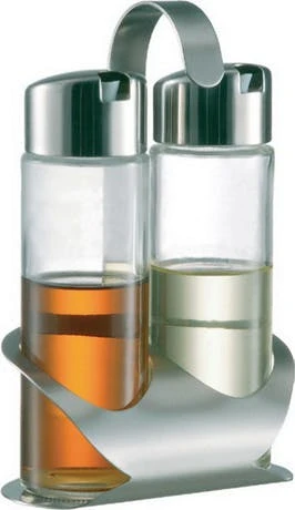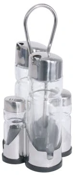 Gestell Edelstahl 18/0 mit schwarzem Kunststoff- boden, Pressglaseinsätze mit Kappen aus Edelstahl, tropfsicherer Ausgießer mit Rücklauftrichter.
