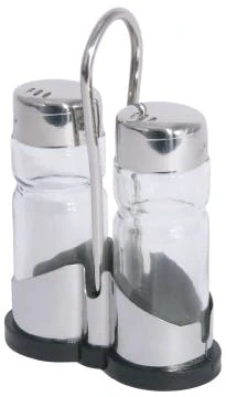 Gestell Edelstahl 18/0 mit schwarzem Kunststoff- boden, Pressglaseinsätze mit Kappen aus Edelstahl 18/10.