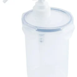 Dispenser, rund mit 30 ml Pumpe, mit Pumpaufsatz 1312, leicht zerlegbar, auf verschließbaren Dosen aus transparentem Polypropylen, lebensmittelgeeignet