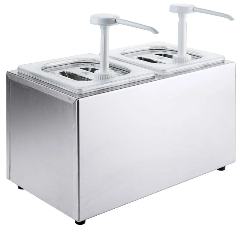 Gestell ohne Einsätze zu Saucendispenser mit einem Ausschnitt, aus Edelstahl, allseitig geschlossen, mit 100 mm tiefen GN 1/6 Einsätzen aus Polycarbonat, mit im Deckel integrierter Pumpe 1312 aus Polypropylen, für Portionsgröße 30 ml