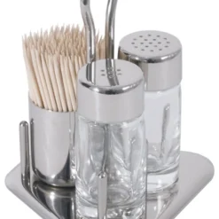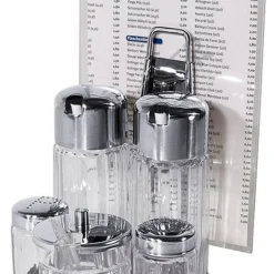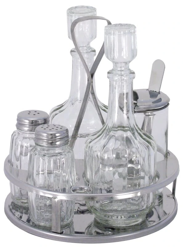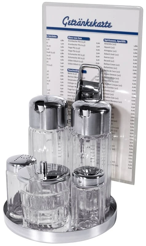 Menage Salz/Pfeffer, Essig/Ăl, Senf, aus Edelstahl 18/10, hochglĂ€nzend, mit schweren geriffelten GlaseinsĂ€tzen fĂŒr Salz und Pfeffer, Essig und Ăl (mit tropffreien AusgĂŒssen) sowie Senf, mit Klemmvorrichtung fĂŒr Speisekarten