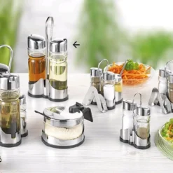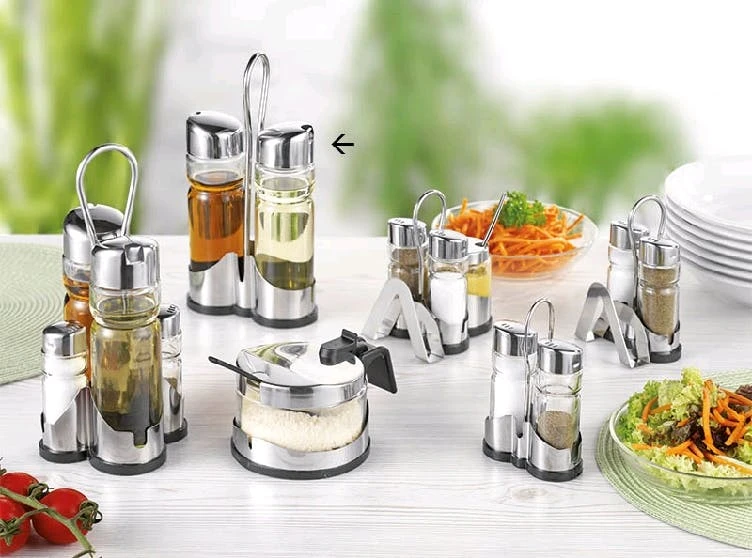 Menage Essig/Öl, Gestell aus hochglänzendem Edelstahl 18/0, mit schwarzem Kunststoffboden, Pressglaseinsätze mit Kappen aus Edelstahl 18/10, tropfsicherer Ausgießer mit Rücklauftrichter