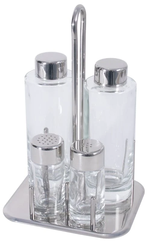 Menage Salz/Pfeffer, Essig/Öl, Gestell aus hochglänzendem Edelstahl 18/0, mit schwarzem Kunststoffboden, Pressglaseinsätze mit Kappen aus Edelstahl 18/10, tropfsicherer Ausgießer mit Rücklauftrichter