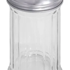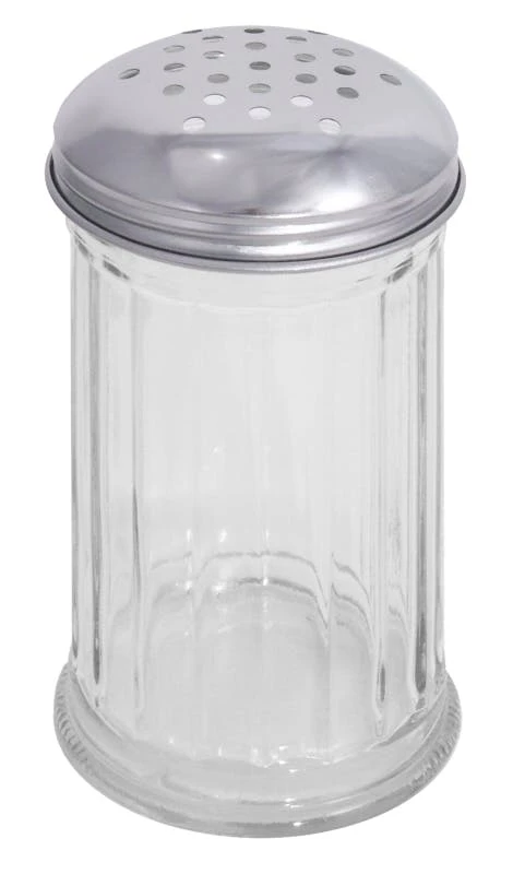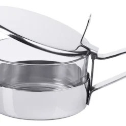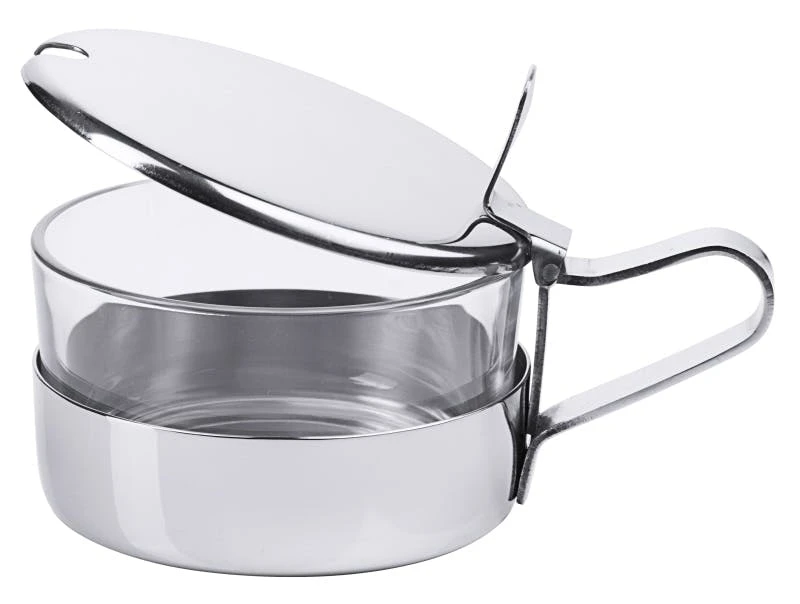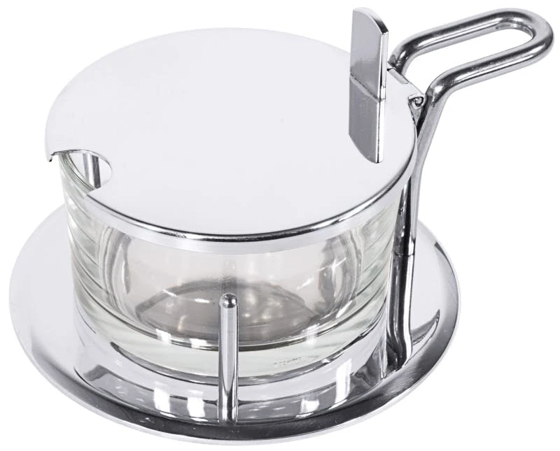 Parmesandose, Gestell aus hochglänzendem Edelstahl 18/0, mit schwarzem Kunststoffboden, Deckel aus Edelstahl 18/10, mit Löffel, auch für Konfitüren geeignet