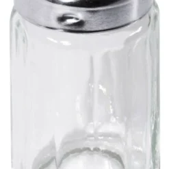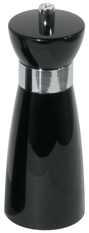 Parmesanmühle, aus klarem Polycarbonat und schwarzem ABS-Kunststoff, mit Edelstahlmahlwerk, der Parmesankäse wird in zwei Kammern eingefüllt, durch Drehen des Kopfes wird die Drückplatte angepresst und der Käse gemahlen, der Gast sieht den frischen Parmesan, alles bleibt hygienisch, zerlegbar, spülmaschinengeeignet