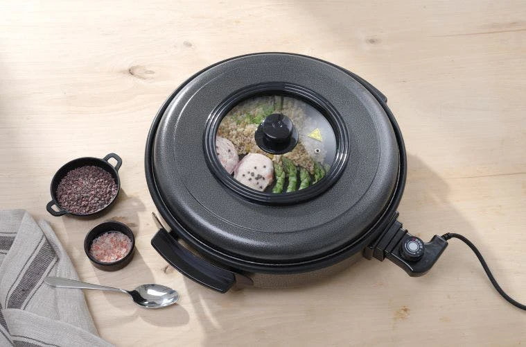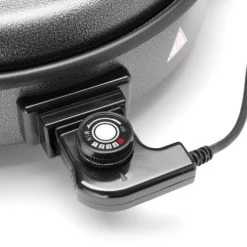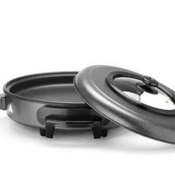 Aluminium mit Antihaftbeschichtung. Abnehmbarer Thermostat. Geeignet zum Frittieren, Braten und Warmhalten. Inklusive Deckel mit Klarglas und zwei isolierten Griffen.
