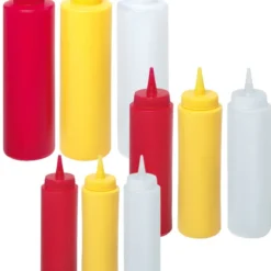 Flasche aus Polyethylen, Verschlusskappe aus Polypropylen. Hygienische Verschlusskappe hÀlt die Saucen lÀnger frisch.