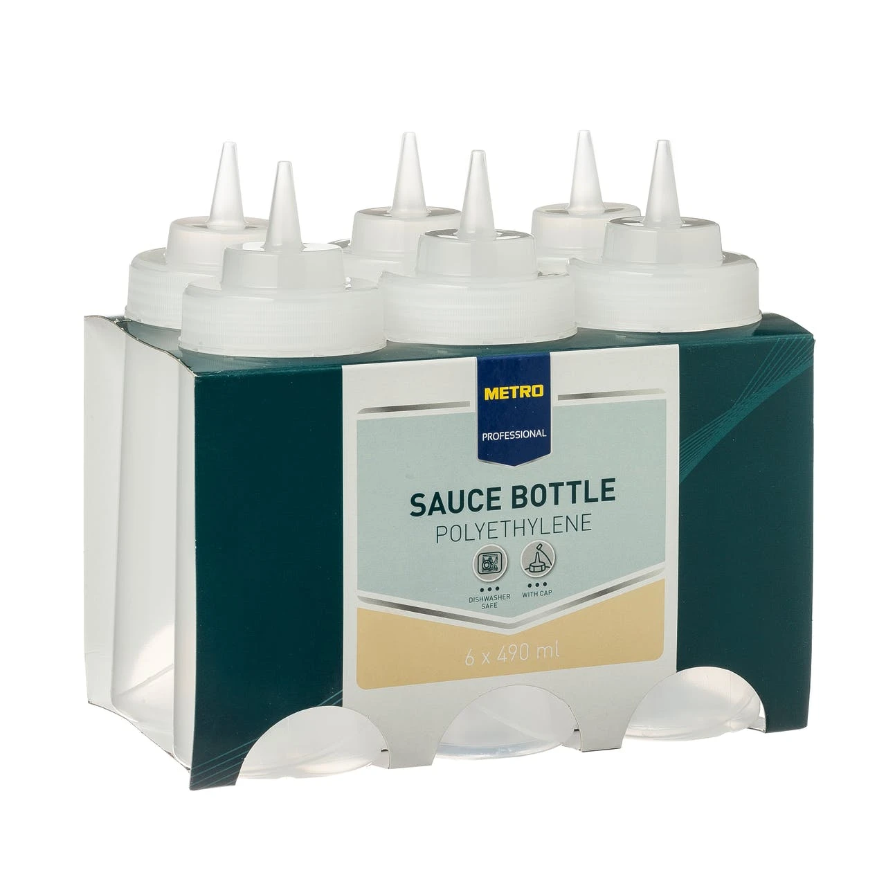 Die METRO Professional Quetschflasche (transparent) mit Verschlusskappe und Schraubverschluss hat einen weiten Flaschenhals für einfaches Nachfüllen. Die Flasche hat eine Höhe von 20 cm und eine Kapazität von 490 ml, ideal für Ketchup, Senf, Mayo, Soßen oder Olivenöl. Die Flasche ist lebensmittelecht und hält Temperaturen von bis zu 90 °C stand.