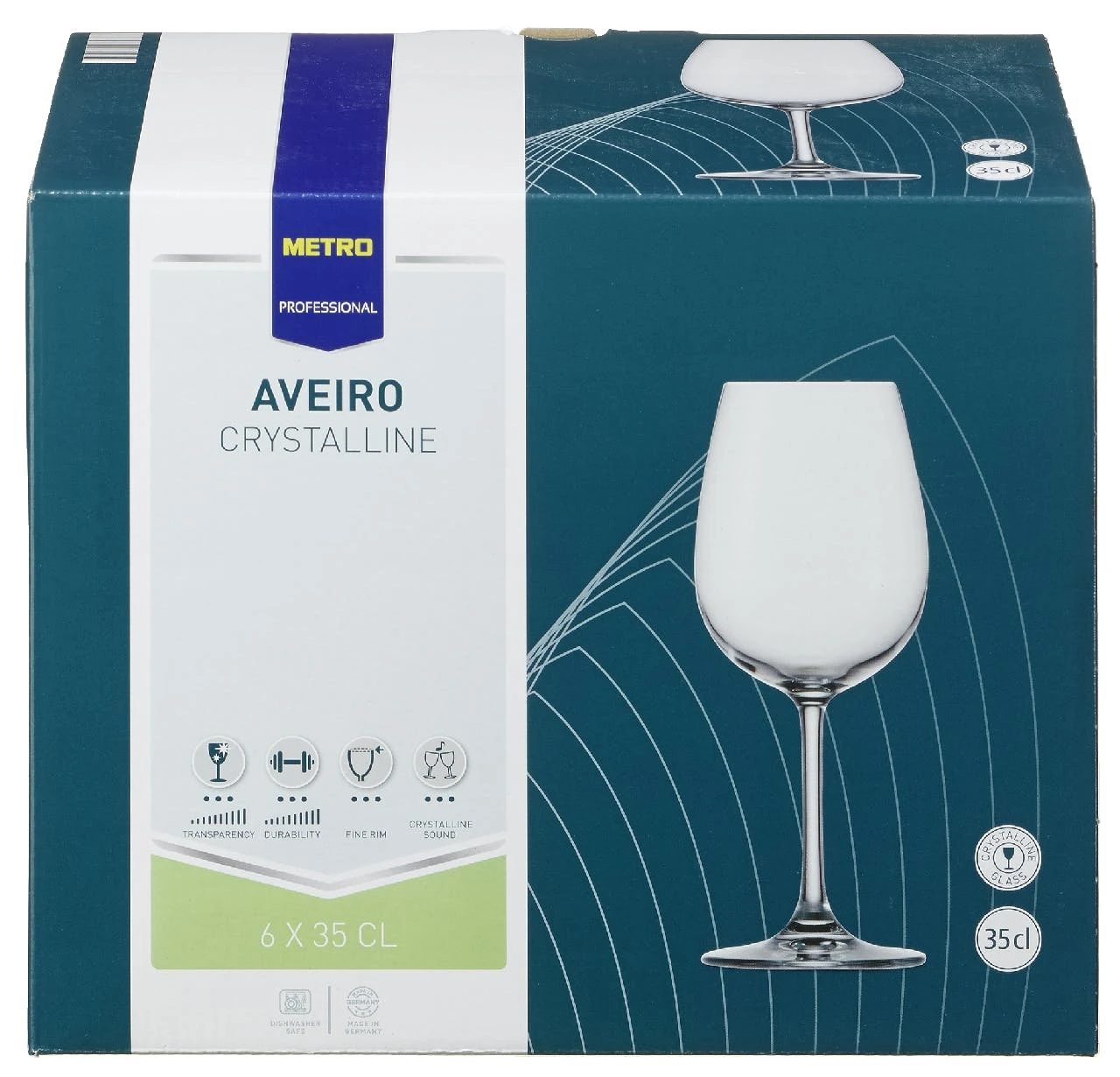 Das Aveiro Weißweinglas von METRO Professional in klassischer Form hat ein Fassungsvermögen von 35 cl und ist aus Kristallglas gefertigt. Der feine Rand ist kalt geschnitten. Das Glas hat eine hohe Transparenz, Haltbarkeit und ist spülmaschinenfest. Es sind 6 Gläser im Lieferumfang enthalten.