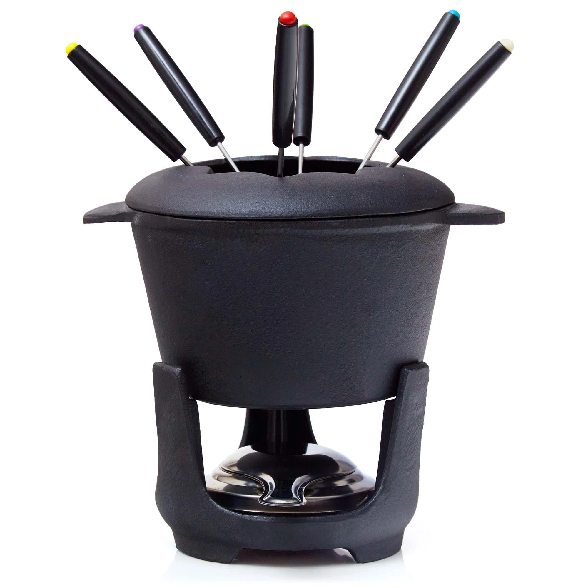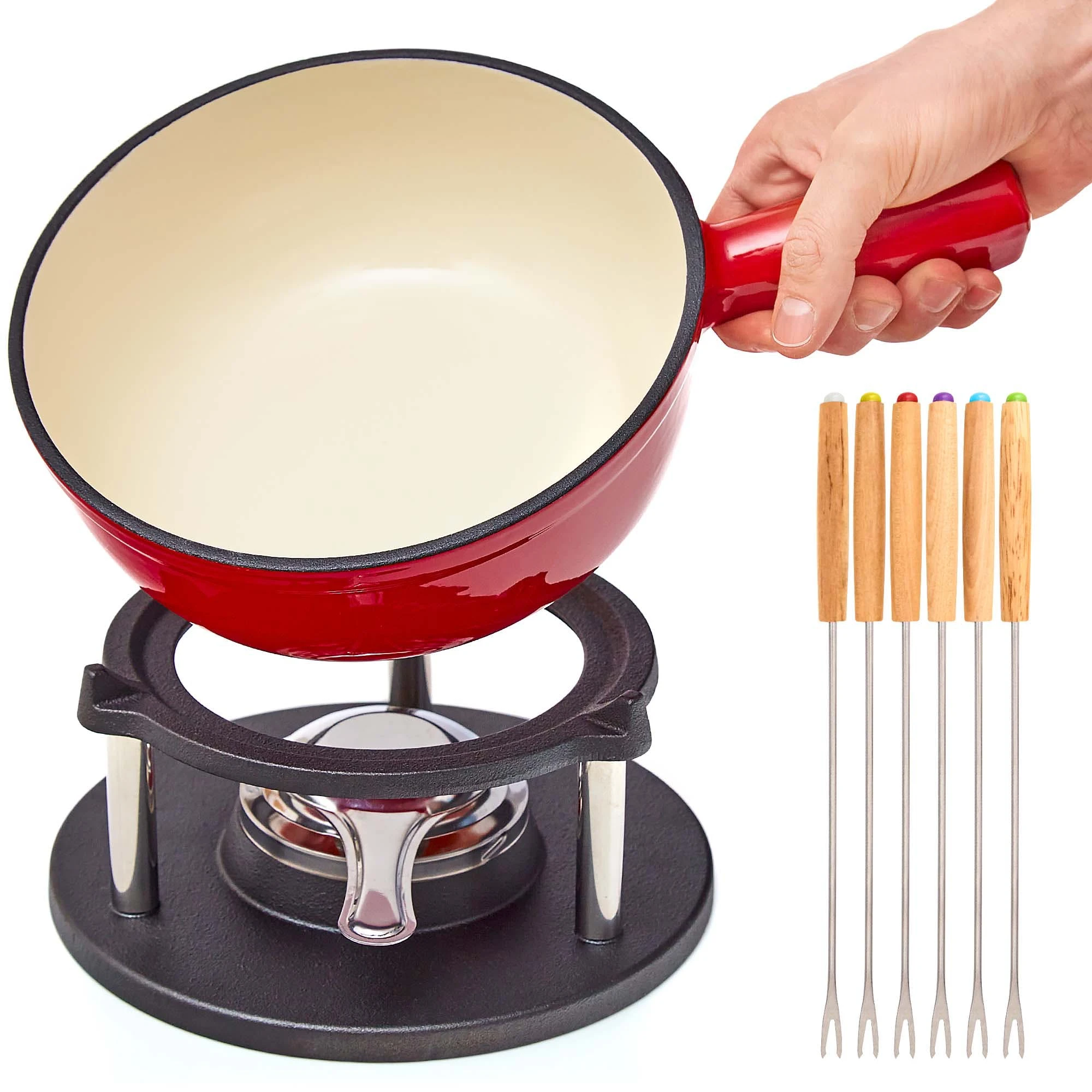 - FÜR 6 PERSONEN – Das Set enthält 1 Fonduetopf (Fassungsvermögen: 2 Liter), 1 Rechaud (= Brennergestell), 1 Brennpastenbehälter mit Flammenverteiler sowie 6 farbig markierte Fonduegabeln mit Holzgriff (je 24 cm lang). Die Brennpaste muss extra gekauft werden.