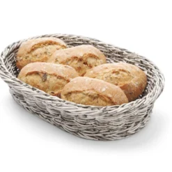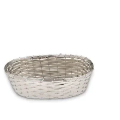Großer, ovaler Brotkorb aus versilbertem Messing. Der Brotkorb hat eine Höhe von 10,5 cm, eine Länge von 30,0 cm und eine Breite von 18,0 cm.