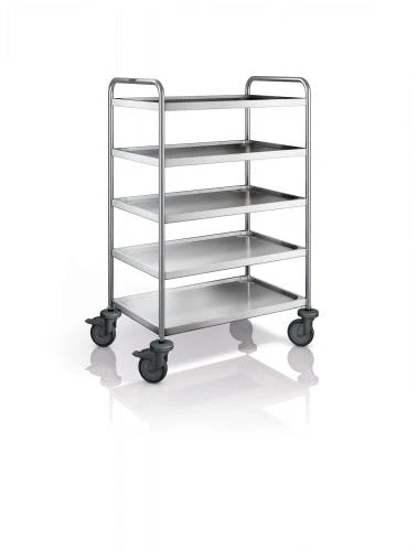 Typ: SW-8X5-5, mit: 5 Borden, Maße der Borde: 800 x 500 mm, Abstand zw. Borden: 205 mm, Tragfähigkeit: 120 kg, 4 Lenkrollen: ø 125mm, davon 2, feststellb., Kunstst.,rostfrei, Material: Chromnickelst