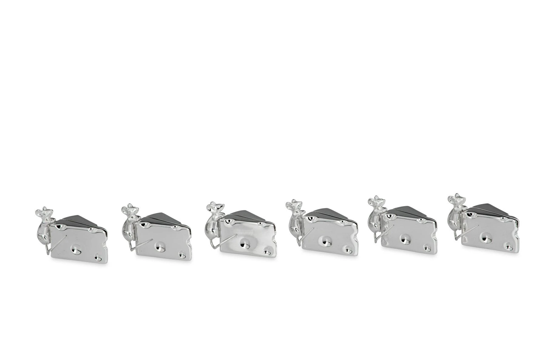 Tischkartenhalter-Garnitur 6-teilig, “Käse/Maus” inklusive 6 Namenskarten, versilbert, per Stück L 2,5cm, B 1,5cm, H 2,0cm