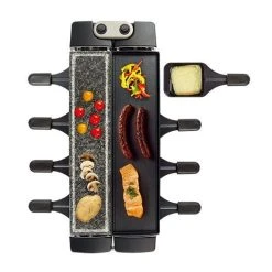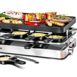 Der Raclette-Grill verfügt über eine Dunstabzugshaube mit Kohlefilter zur Beseitigung von Kochgerüchen. Die Temperatur lässt sich über das Thermostat einstellen. Der Grill wird inklusive 8 antihaftbeschichtete Raclette-Pfännchen und 8 Kunststoffspachteln geliefert.