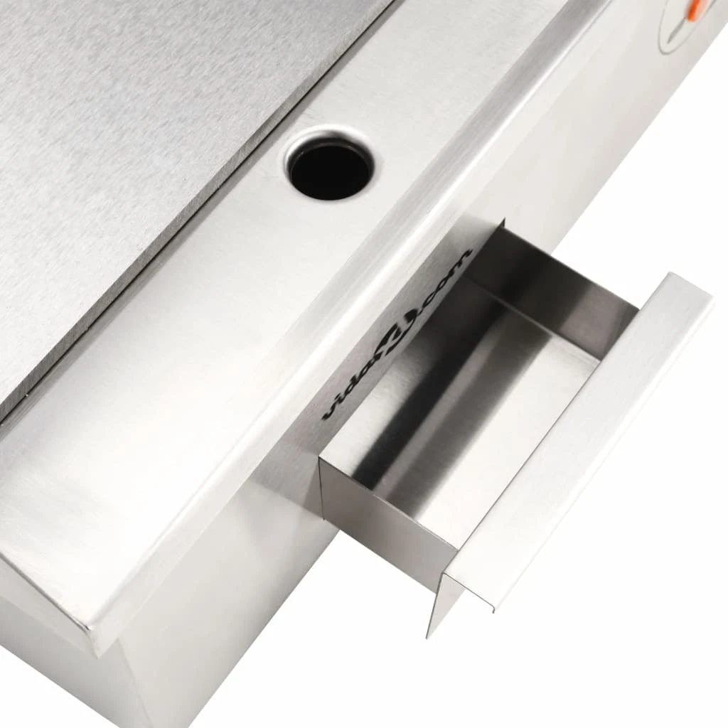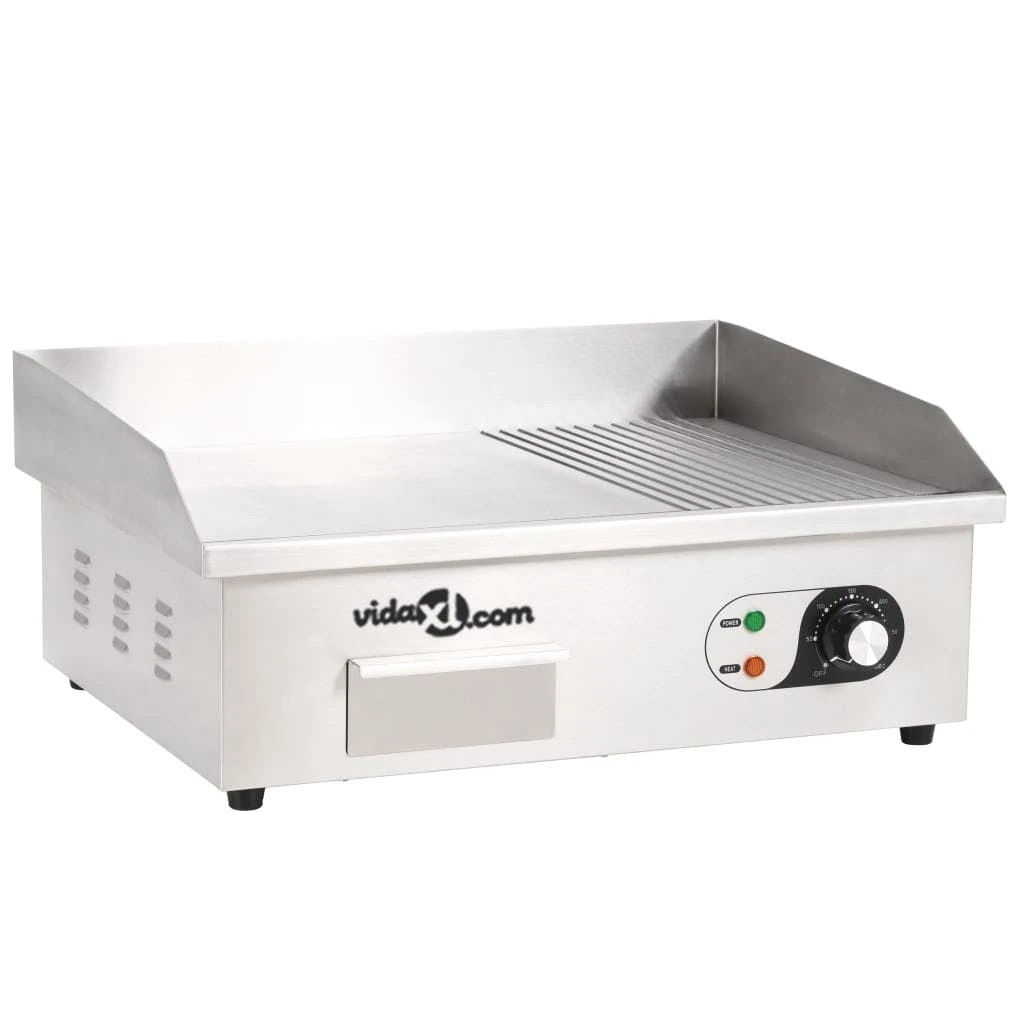 Unsere elektrische Grillplatte verfügt über eine Bratfläche mit zwei Abschnitten (flache und gerillte Oberfläche) und ist ideal zum Braten von Eiern, zum Zubereiten von Pfannkuchen, Hamburgern, Gemüse, Hühnchen, Steak usw. Es eignet sich hervorragend für Cafés, Kantinen und Küchen. Diese elektrische Grillplatte ist aus strapazierfähigem Edelstahl gefertigt, der ein tolles Aussehen mit sich bringt sowie langlebig und leicht zu reinigen ist. Es ist mit einem Temperaturregler von 50 °C bis 300 ºC für variable Heizstufen, von niedrig über mittel bis hoch, ausgestattet. Die Grillplatte hat eine Auffangschale zum Sammeln von überschüssigem Öl, das zur Reinigung leicht entfernt werden kann. Der eingebaute Spritzschutz verhindert das Spritzen von Öl und vermeidet unnötige Unordnung.
